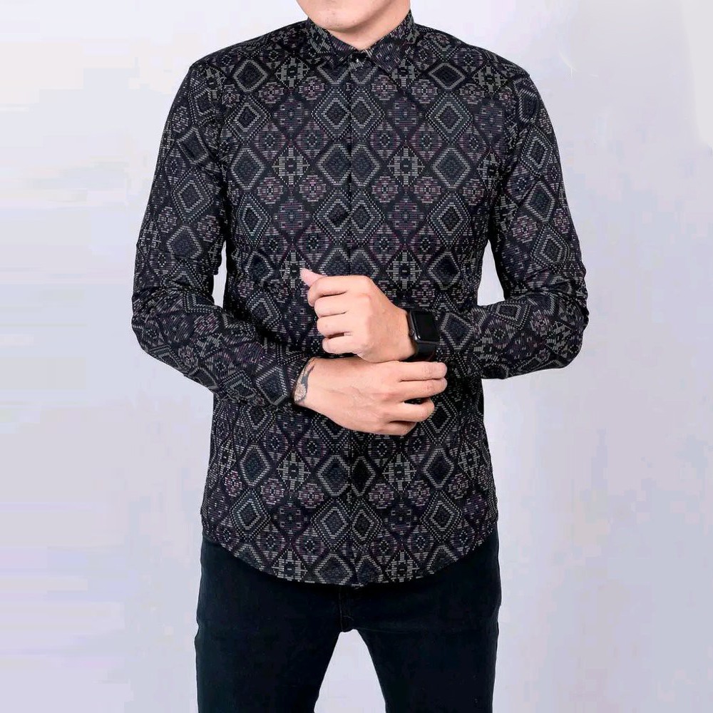 Name: Baju Batik Kemeja Batik Pria Lengan Panjang Songket Diamond Hitam Modern Slimfit Casual Black